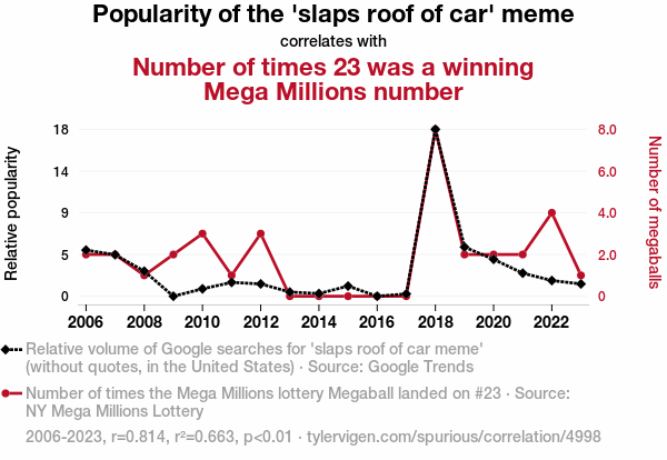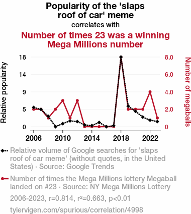 - The spurious research paper: Slap Me If I'm Wrong, But Is 23 the New Lucky Number? Exploring the Correlation Between the 'Slaps Roof of Car' Meme Popularity and 23 as a Winning Mega Millions Number