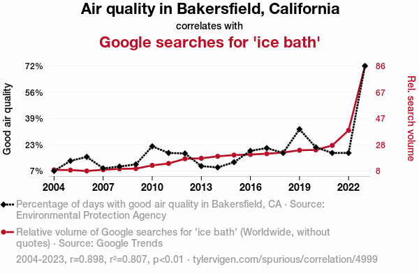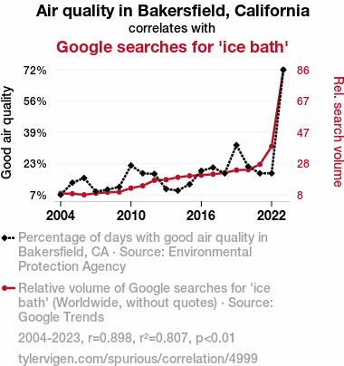 - The spurious research paper: Chilling Correlations: The Relationship Between Air Quality in Bakersfield, California, and Google Searches for 'Ice Bath'