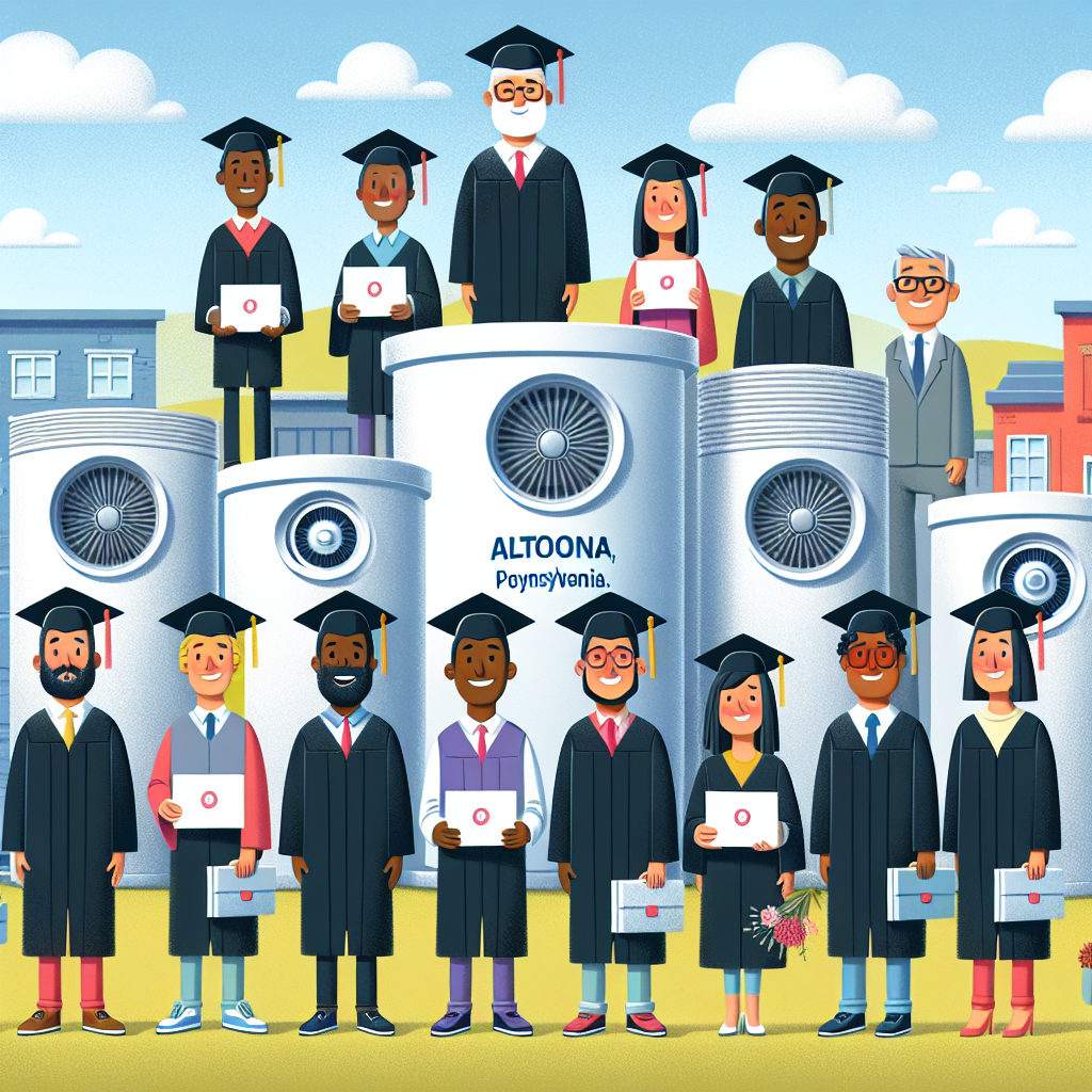 ChatGPT: A group of enthusiastic graduates with Associates degrees in Physical sciences gather in Altoona, Pennsylvania, holding up their degrees with pride. They stand amidst a row of high-tech air purifiers, showcasing their latest innovative designs. The machines hum softly as they efficiently filter out pollutants, visibly improving the air quality around them. The graduates share excited looks, knowing that their scientific knowledge has truly elevated Altoona's atmosphere to a new level of purity.