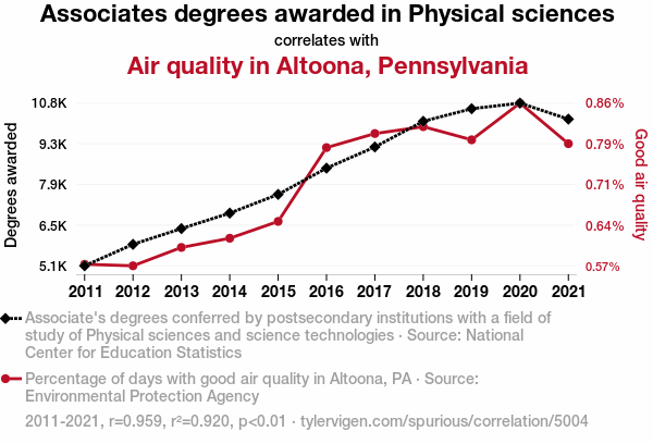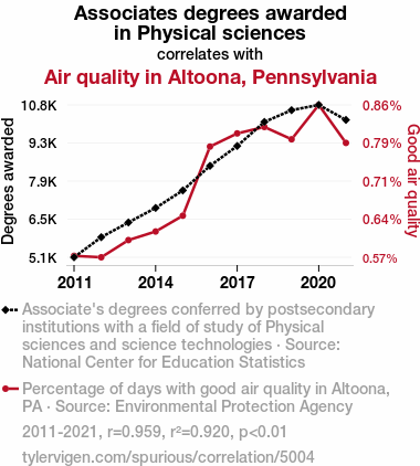 This means 92% of the change in the one variable (i.e., Air quality in Altoona, Pennsylvania) is predictable based on the change in the other (i.e., Associates degrees awarded in Physical sciences) over the 11 years from 2011 through 2021.
