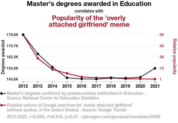 - The spurious research paper: The Meme of Educational Popularity: Unraveling the Connection Between Master's Degrees in Education and the 'Overly Attached Girlfriend' Phenomenon