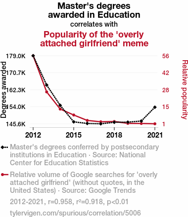 Master's degrees in Education, Overly Attached Girlfriend meme, correlation between education and memes, National Center for Education Statistics, Google Trends, influence of academic pursuits on internet culture