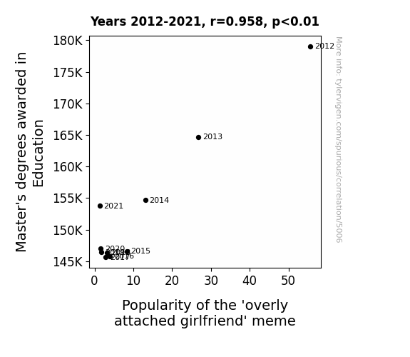 The tight clustering of data points in our scatterplot provides visual evidence of the robust relationship between Master's degrees in Education and the proliferation of the 'overly attached girlfriend' meme. It's as if these seemingly distinct realms were destined to be linked in the annals of internet history – a match made in statistical heaven, if you will. Our results have illuminated a remarkable synergy between the pursuit of advanced education in the field of Education and the dissemination of internet memes, showcasing the unexpected, whimsical, and perhaps even quirky connections that emerge when we peer into the captivating world of data and memes.