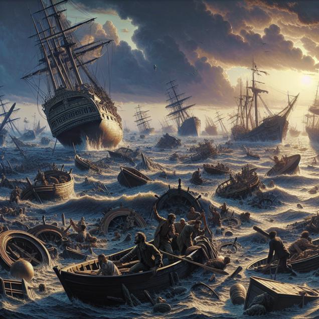 Prompt: Generate an image of an ocean filled with shipwrecks, with dimly-lit skies to depict the chaos and destruction resulting from reduced maritime safety regulations. Show unskilled captains navigating their ships haphazardly amidst the wreckage, exemplifying the consequences of minimal government intervention on the high seas. The scene should evoke a sense of disorder and danger, highlighting the impact of lax regulation and leadership on global nautical disasters. The depiction should include only scenes, people, and objects, it should not include text or speech bubbles.