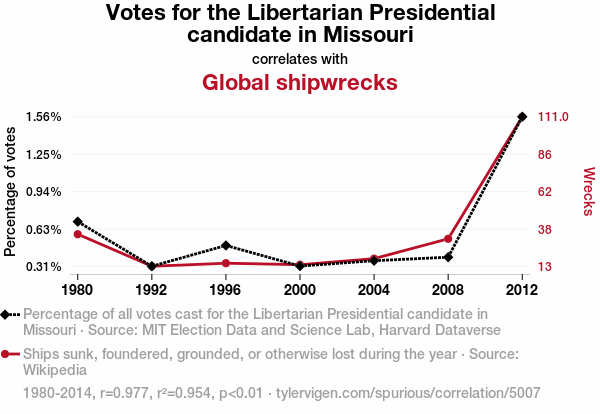 User prompt: Please provide potential search keywords for a paper titled Navigating the Nexus: Exploring the Interplay between Votes for the Libertarian Presidential Candidate in Missouri and Global Shipwrecks with an abstract of This study aims to disentangle the enigmatic relationship between votes for the Libertarian presidential candidate in the state of Missouri and the occurrences of global shipwrecks. Leveraging data from the MIT Election Data and Science Lab, Harvard Dataverse, and Wikipedia, we adopted a quantitative approach to scrutinize this curious association. Surprisingly, our analysis revealed a striking correlation coefficient of 0.9766440 and p < 0.01 between these seemingly disparate phenomena from 1980 to 2014, defying traditional expectations. This unexpected correlation prompts the need for further investigation into the underlying mechanisms that may connect political preferences in the Show-Me State with maritime misadventures worldwide. Our findings underscore the importance of considering unconventional variables in political and maritime analyses, challenging researchers to navigate uncharted waters in the quest for new knowledge.