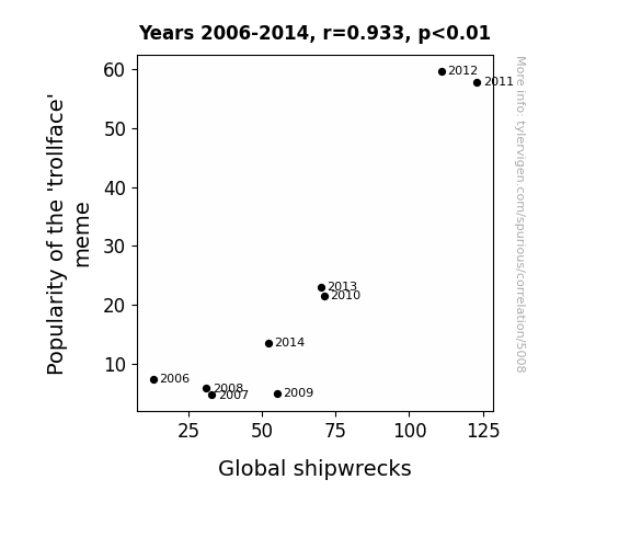 This paper presents the unexpected correlation between the popularity of the 'trollface' meme and the occurrence of global shipwrecks. Utilizing Google Trends and Wikipedia data from 2006 to 2014, our research team identified a noteworthy correlation coefficient of 0.9330747 and a p-value lower than the esteemed 0.01 threshold. While exploring the relationship between internet memes and maritime disasters may initially seem like a joke, our findings offer intriguing insights.