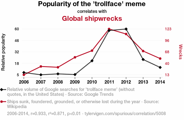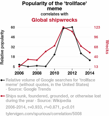 'trollface' meme, maritime disasters, correlation, internet memes, shipwrecks, Google Trends, Wikipedia data, nautical misfortunes, internet culture, global events, meme influence, research, correlation coefficient, p-value