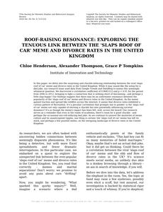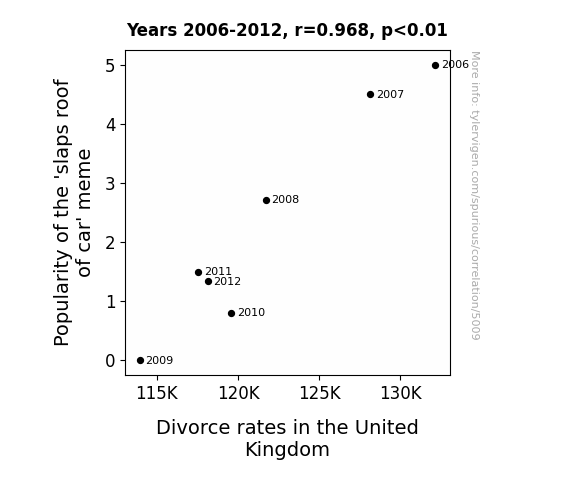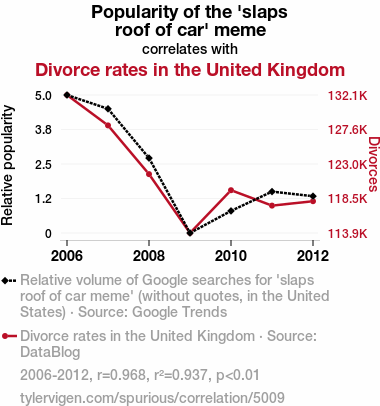 - The spurious research paper: Roof-Raising Resonance: Exploring the Tenuous Link between the 'Slaps Roof of Car' Meme and Divorce Rates in the United Kingdom