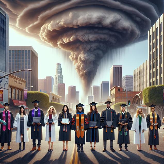 ChatGPT: Create an image that encapsulates the essence of a Discovery magazine cover; a picture-perfect portrayal of a group of individuals draped in graduation gowns, adorned with Master's degrees in Agriculture and natural resources, standing confidently on the sun-drenched streets of Los Angeles. As they jubilate, the dramatic formation of rain clouds overhead foretells an impending downpour. The people seem to radiate a sense of pride and accomplishment, almost as if their academic proficiency is triggering the cascading rainfall, ultimately illustrating their growing expertise in weather manipulation and their role in bringing nourishment to the West Coast.