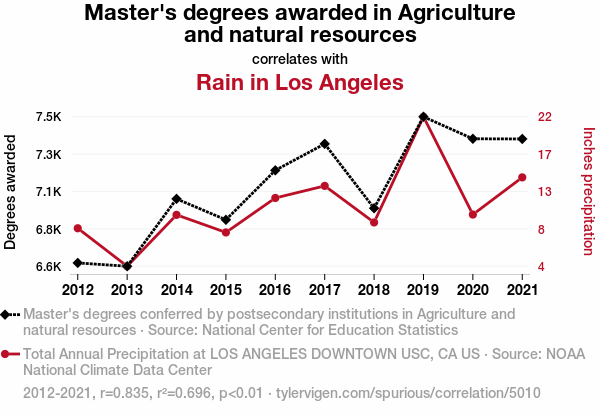 This means 69.6% of the change in the one variable (i.e., Rain in Los Angeles) is predictable based on the change in the other (i.e., Master's degrees awarded in Agriculture and natural resources) over the 10 years from 2012 through 2021.