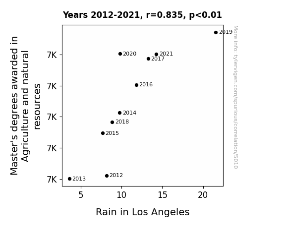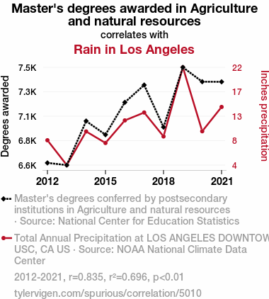 Master's degrees in agriculture, natural resources, Los Angeles rainfall, correlation, National Center for Education Statistics, NOAA National Climate Data Center, urban agriculture, precipitation patterns, human knowledge and natural elements, environmental impact of academic pursuits
