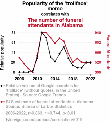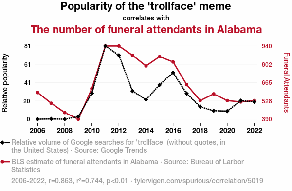 trollface meme, funeral attendance correlation, internet meme influence, societal behaviors, digital culture, Google Trends data, Bureau of Labor Statistics, internet humor impact, funeral attendance in Alabama, statistical relationship, online humor and real-world gatherings, internet memes and societal rituals