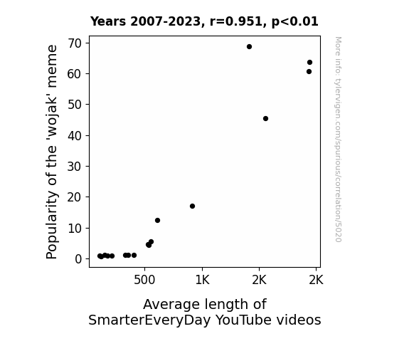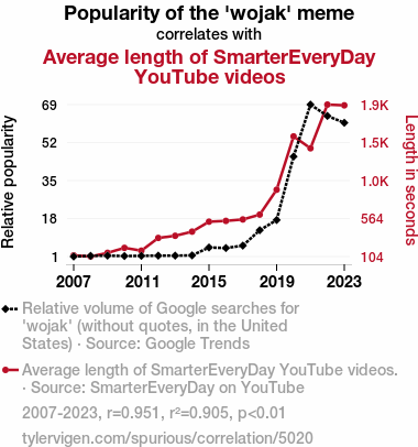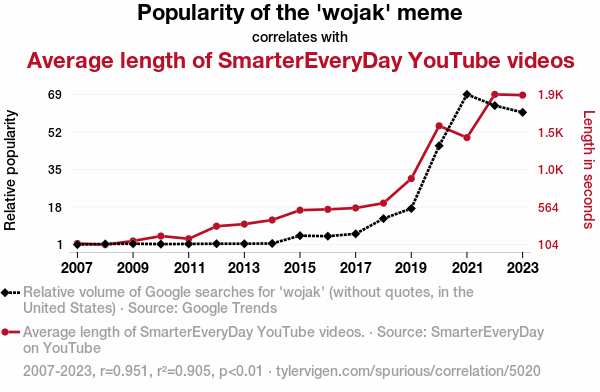 This means 90.5% of the change in the one variable (i.e., Average length of SmarterEveryDay YouTube videos) is predictable based on the change in the other (i.e., Popularity of the 'wojak' meme) over the 17 years from 2007 through 2023.