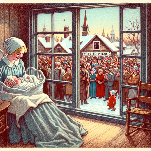 User prompt: Please respond with an image generation prompt that would be likely to create an interesting visual using DALLE-3, using the following style: [ A comic-book-style illustration with muted colors and a dotted halftone pattern from the 1960s ] and depicting this scene: In a cozy Minnesota nursery, little Layne is welcomed into the world with joy and laughter. As the proud parents celebrate, outside the window, a crowd has gathered, caught up in fervent discussions about the upcoming election. As if by magic, with every Layne born, the Democratic candidate's support in Minnesota grows palpably - a phenomenon noticed and pondered by curious onlookers. These parallel events seem to unfold in harmony, their connection an enigma that fascinates and captivates the community. Keep the visual depiction simple. Do not include any words or speech bubbles.