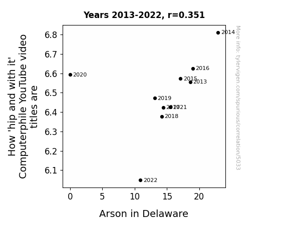 This means 12.3% of the change in the one variable (i.e., Arson in Delaware) is predictable based on the change in the other (i.e., How 'hip and with it' Computerphile YouTube video titles are) over the 10 years from 2013 through 2022.
