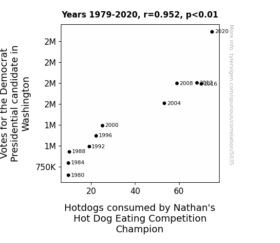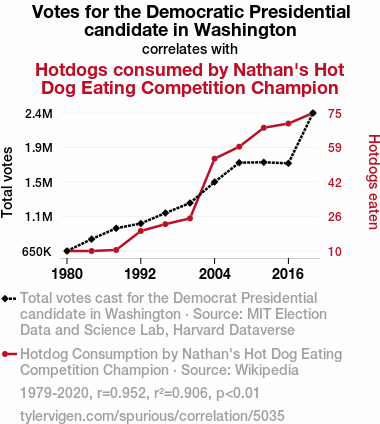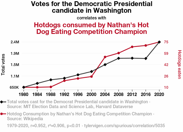 - The spurious research paper: The Ballot and the Bun: An Examination of the Correlation between Democratic Votes in Washington State and Hotdog Consumption by Nathan's Hot Dog Eating Competition Champion