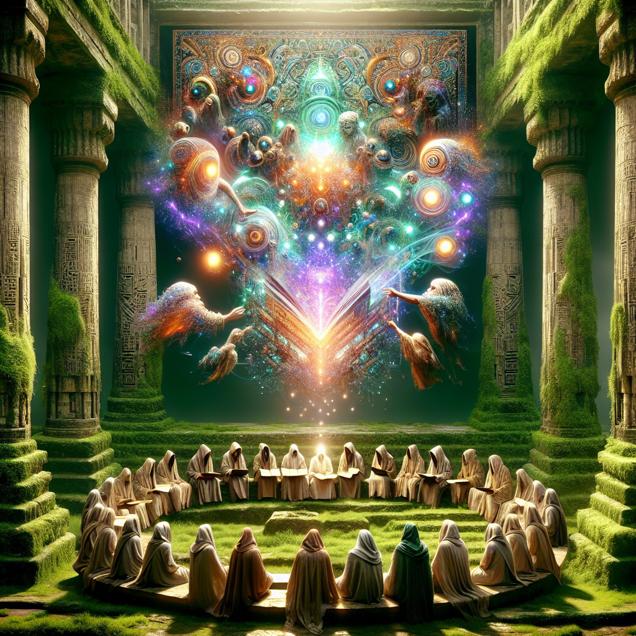 Prompt: [ Whimsical illustration ] Generate an image of the lush green courtyard of an ancient temple. In the center, depict a group of hooded figures huddled around a stone altar. Behind them, an intricate tapestry with the name "Jude" hanging on the wall gives off an aura of reverence and mystical energy. The figures are illuminated by a shimmering glow, holding parchment scrolls and whispering in hushed tones. Hovering above them, a digital screen displays a mesmerizing array of captivating Deep Look video titles, each shining with clever wordplay and creativity. The juxtaposition of the ancient mystique of the Jude secret society and the modern brilliance of the captivating video titles creates a striking image of intertwined influence. The depiction should include only scenes, people, and objects, it should not include text or speech bubbles.