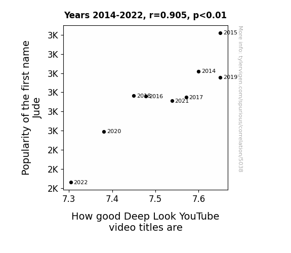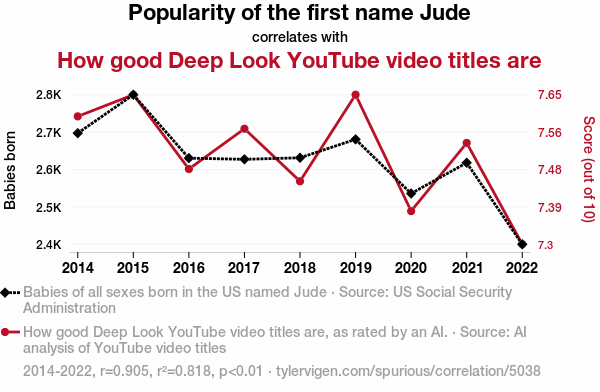 User prompt: Please provide potential search keywords for a paper titled The Popularity of Jude and How Good Deep Look Video Titles Intrude: A Quirky Quest with an abstract of The presented study delves into the quirky connection between the popularity of the first name "Jude" and the quality of titles for YouTube videos, with a particular focus on the acclaimed series "Deep Look." Utilizing data from the US Social Security Administration to track the ebb and flow of the name "Jude" and employing AI analysis to scrutinize the YouTube video titles, our research team unearthed a correlation coefficient of 0.9046413 and p < 0.01 for the years 2014 to 2022. Our findings not only tickle the intellect but also raise questions about the enigmatic allure of the name "Jude" and its potential influence on the creative prowess of video titling. The interplay between these seemingly disparate entities enlivens the academic landscape, adding a dash of whimsy amidst the rigors of statistical analysis and theoretical contemplation.
