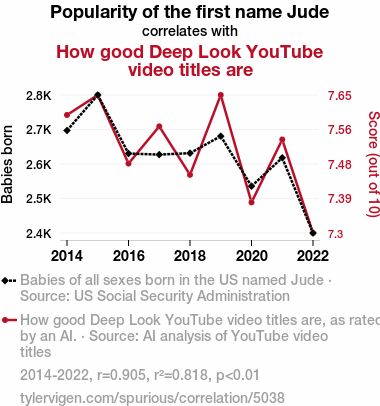 This means 81.8% of the change in the one variable (i.e., How good Deep Look YouTube video titles are) is predictable based on the change in the other (i.e., Popularity of the first name Jude) over the 9 years from 2014 through 2022.