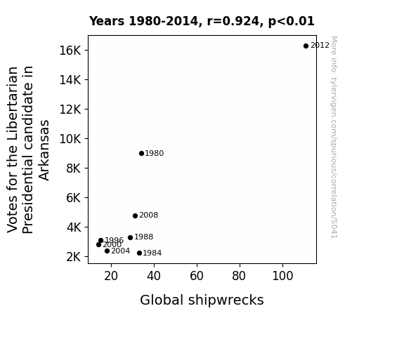 Libertarian presidential votes, Arkansas, global shipwrecks, correlation analysis, MIT Election Data and Science Lab, Harvard Dataverse, voter preferences, maritime mishaps, statistical analysis, voter behavior, human choices, interconnectedness, human behavior, global maritime activities