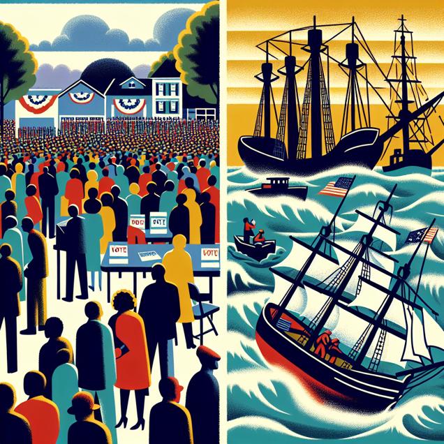 Prompt: Prompt: Create a pop art style visual depicting a busy Arkansas landscape with a long line of voters at polling stations. In the midst of this, showcase a chaotic scene at sea with amateur boats and ships colliding, causing maritime havoc and shipwrecks. The contrast between the serene landscape and the chaotic seas should be the focal point of the image. The depiction should include only scenes, people, and objects, it should not include text or speech bubbles.