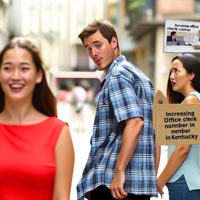 User prompt: Please make up a funny explanation for how an increase in Popularity of the 'distracted boyfriend' meme caused The number of office clerks in Kentucky to increase. Add a funny one-liner at the end.