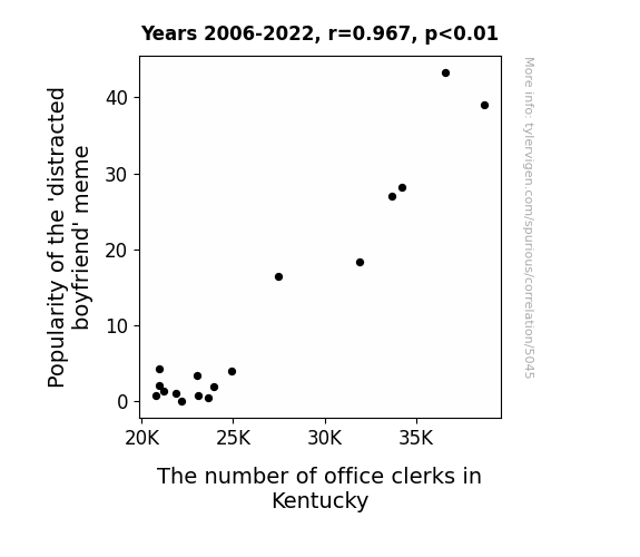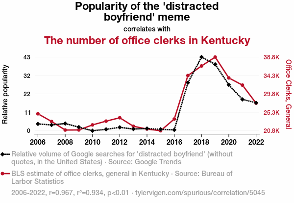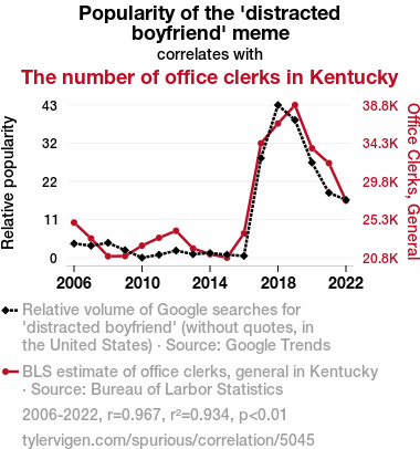 - The spurious research paper: From Distracted Boyfriend to Distracted Clerk: Exploring the Correlation Between the Popularity of the 'Distracted Boyfriend' Meme and the Number of Office Clerks in Kentucky