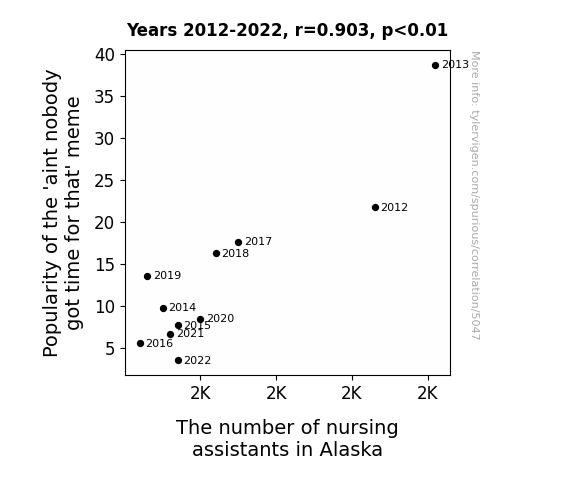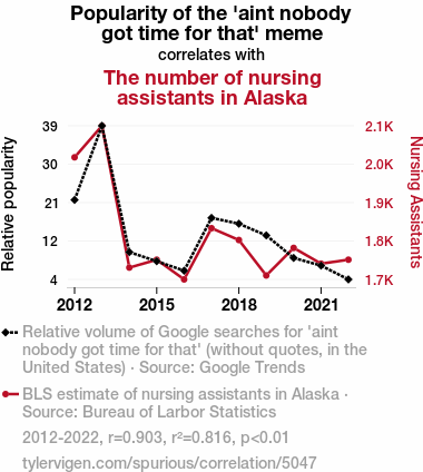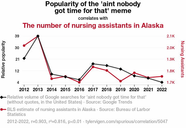This means 81.6% of the change in the one variable (i.e., The number of nursing assistants in Alaska) is predictable based on the change in the other (i.e., Popularity of the 'aint nobody got time for that' meme) over the 11 years from 2012 through 2022.