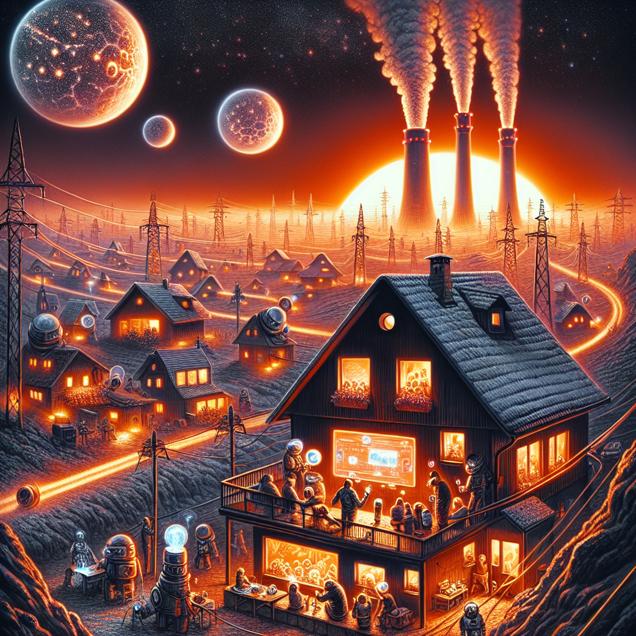 User prompt: Please respond with an image generation prompt that would be likely to create an interesting visual using DALLE-3, using the following style: [ An image that looks like it is a scene from 'Star Wars' ] and depicting this scene: A bustling Slovenian household lights up as viewers flock to Casually Explained YouTube videos, driving up the total views. The electrical grid hums with increased demand, drawing additional power from the fossil fuel plants, their smokestacks billowing clouds into the sky. Keep the visual depiction simple. Do not include any words or speech bubbles.