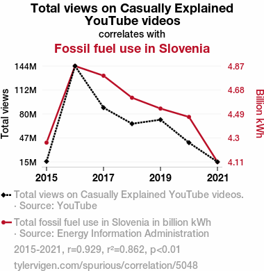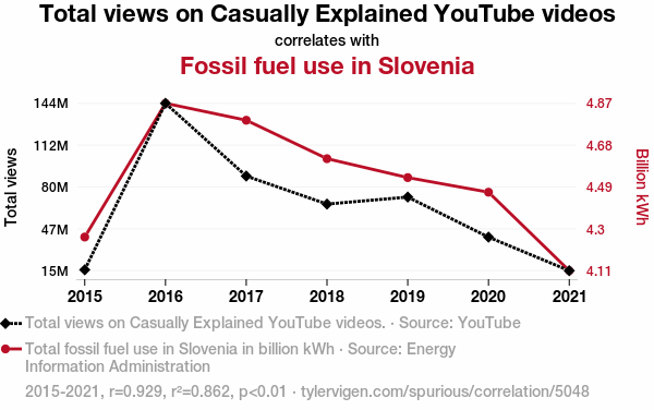 This means 86.2% of the change in the one variable (i.e., Fossil fuel use in Slovenia) is predictable based on the change in the other (i.e., Total views on Casually Explained YouTube videos) over the 7 years from 2015 through 2021.