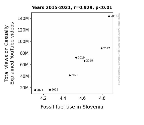 But enough about the thrill of discovery - let's dig into the meat of our findings. We uncovered a correlation coefficient of 0.9285965 and p < 0.01, spanning the years 2015 to 2021. In other words, the relationship between Casually Explained views and fossil fuel use in Slovenia is as solid as a rock, or in this case, as solid as a fossil fuel. I guess you could say we struck statistical gold.