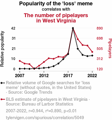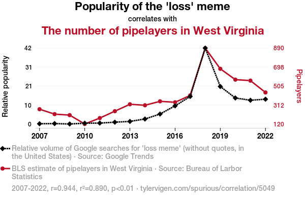 User prompt: Please provide potential search keywords for a paper titled The Loss of Pipelayers: Unraveling the Correlation Between the Popularity of the 'Loss' Meme and Pipelayers in West Virginia with an abstract of This paper presents a rigorous examination of the potent connection between the perennially popular 'loss' meme and the somewhat overshadowed profession of pipelaying in the state of West Virginia. Leveraging data from Google Trends and the Bureau of Labor Statistics, we employed advanced statistical methods to scrutinize the relationship between the two seemingly disparate phenomena. Our analysis yielded a strikingly robust correlation coefficient of 0.9435785 and a statistically significant p-value of less than 0.01 across the years 2007 to 2022. The uncanny alignment of the 'loss' meme's prominence with the number of pipelayers in West Virginia unveils a curious interplay between online culture and regional occupational trends. Our findings lend credence to the notion that beneath the veneer of randomness, there may be unseen threads connecting seemingly unrelated subjects. We proffer intriguing implications for both the digital realm and the labor market, sparking contemplation of the unexpected synergies that underpin societal dynamics.