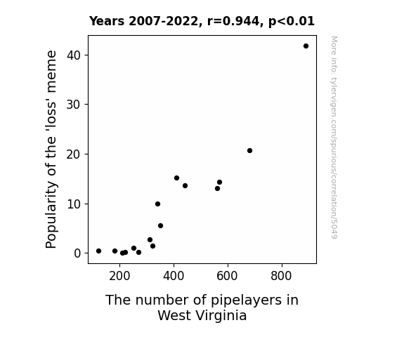 - The spurious research paper: The Loss of Pipelayers: Unraveling the Correlation Between the Popularity of the 'Loss' Meme and Pipelayers in West Virginia