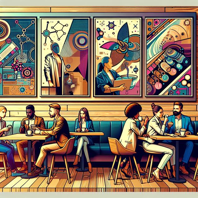 User prompt: Please respond with an image generation prompt that would be likely to create an interesting visual using DALLE-3, using the following style: [ High-tech ] and depicting this scene: In a trendy coffee shop in Georgia, the walls are adorned with colorful posters featuring catchy MinuteEarth video titles like "Microscopic Marvels: The Coolest Microbes You've Never Heard Of." As the hip tunes play in the background, a group of fashionable Georgians enthusiastically discuss microbiology, comparing notes on the latest microbial discoveries and innovations. It's a competition to see who can drop the most cutting-edge microbe knowledge in the most stylish manner, all while sipping artisanal lattes and flaunting their micro-fabulous expertise. Keep the visual depiction simple. Do not include any words or speech bubbles.