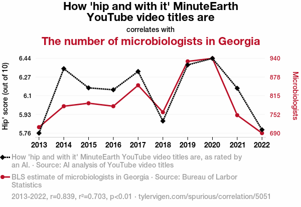 This means 70.3% of the change in the one variable (i.e., The number of microbiologists in Georgia) is predictable based on the change in the other (i.e., How 'hip and with it' MinuteEarth YouTube video titles are) over the 10 years from 2013 through 2022.