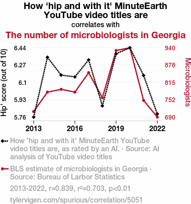 User prompt: Please make up a funny explanation for how increases in How 'hip and with it' MinuteEarth YouTube video titles are positively influenced The number of microbiologists in Georgia.