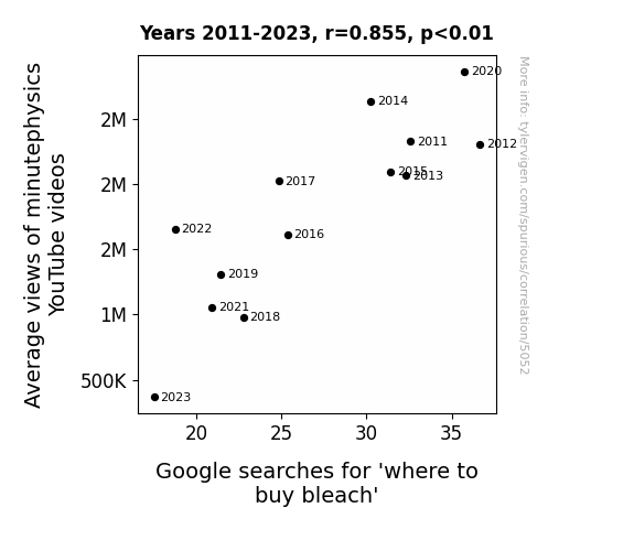 User prompt: Please provide potential search keywords for a paper titled The Tenuous Tie between Techie Tutorials and Troublesome Trend: Average Views of minutephysics and the Quest for Quarts of Bleach with an abstract of This study delves into the often overlooked correlation between the average views of minutephysics YouTube videos and Google searches for 'where to buy bleach'. Our research team embarked on this merry adventure to unravel the mysterious connections that may lie beneath the surface of seemingly unrelated phenomena. We found that there is indeed a significant correlation, with a coefficient of 0.8552044 and p < 0.01 over the period from 2011 to 2023.