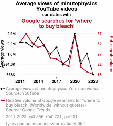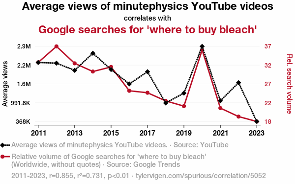 This means 73.1% of the change in the one variable (i.e., Google searches for 'where to buy bleach') is predictable based on the change in the other (i.e., Average views of minutephysics YouTube videos) over the 13 years from 2011 through 2023.