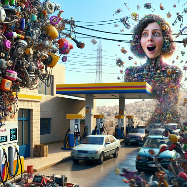 ChatGPT: A woman named Simone is seen in a garage, surrounded by her quirky robotic inventions, while her YouTube video views counter increases rapidly in the background. Outside the garage, a line of cars can be seen at a gas station in Jordan, with the number of gallons pumped displayed prominently.