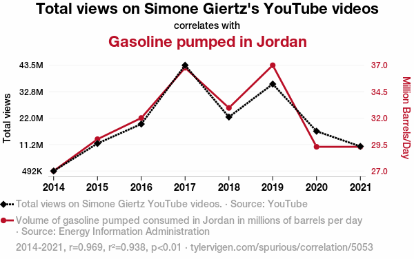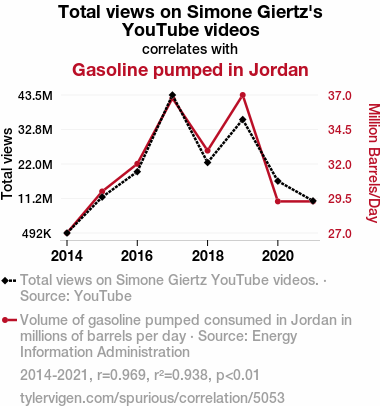 This means 93.8% of the change in the one variable (i.e., Gasoline pumped in Jordan) is predictable based on the change in the other (i.e., Total views on Simone Giertz's YouTube videos) over the 8 years from 2014 through 2021.