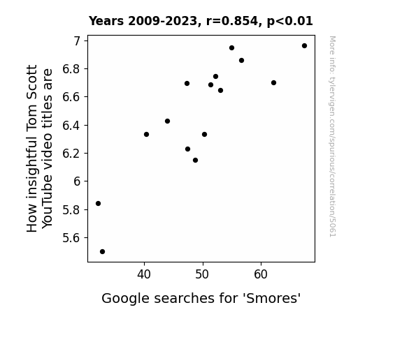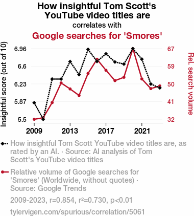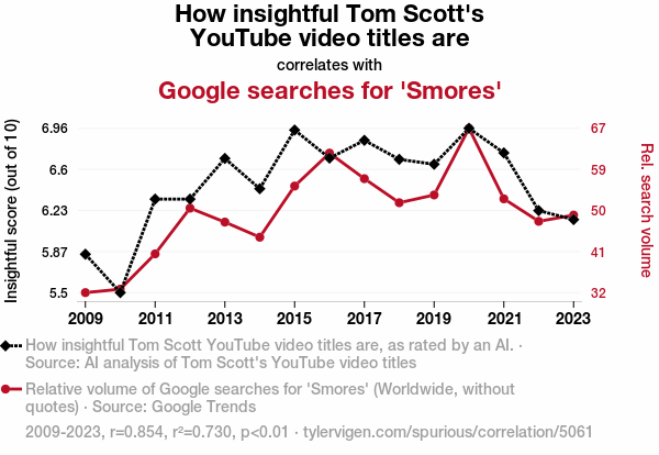 This means 73% of the change in the one variable (i.e., Google searches for 'Smores') is predictable based on the change in the other (i.e., How insightful Tom Scott's YouTube video titles are) over the 15 years from 2009 through 2023.