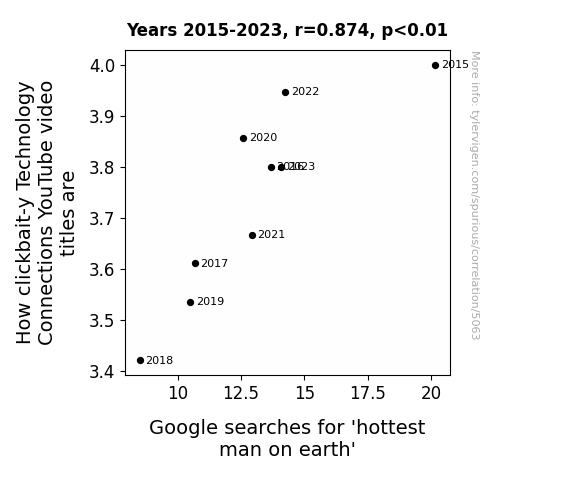 This means 76.4% of the change in the one variable (i.e., Google searches for 'hottest man on earth') is predictable based on the change in the other (i.e., How clickbait-y Technology Connections YouTube video titles are) over the 9 years from 2015 through 2023.