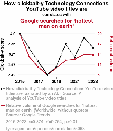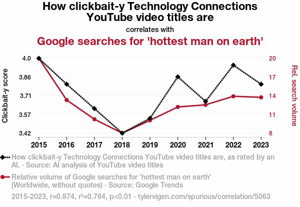 This means 76.4% of the change in the one variable (i.e., Google searches for 'hottest man on earth') is predictable based on the change in the other (i.e., How clickbait-y Technology Connections YouTube video titles are) over the 9 years from 2015 through 2023.