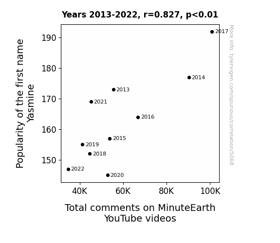 Our findings, with a correlation coefficient of 0.8273213 and p < 0.01 for the years 2013 to 2022, reveal a strikingly strong positive relationship between the prevalence of the name "Yasmine" and the total comments on MinuteEarth YouTube videos. The evidence suggests that as the popularity of the name "Yasmine" increases, engagement with MinuteEarth videos follows suit.