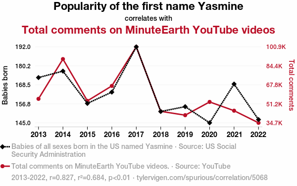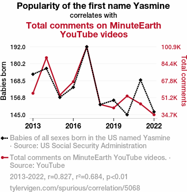 This means 68.4% of the change in the one variable (i.e., Total comments on MinuteEarth YouTube videos) is predictable based on the change in the other (i.e., Popularity of the first name Yasmine) over the 10 years from 2013 through 2022.