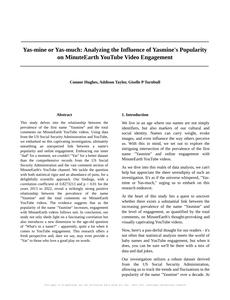 User prompt: Please provide potential search keywords for a paper titled Yas-mine or Yas-much: Analyzing the Influence of Yasmine's Popularity on MinuteEarth YouTube Video Engagement with an abstract of This study delves into the relationship between the prevalence of the first name "Yasmine" and the total comments on MinuteEarth YouTube videos. Using data from the US Social Security Administration and YouTube, we embarked on this captivating investigation, ultimately unearthing an unexpected link between a name's popularity and online engagement.