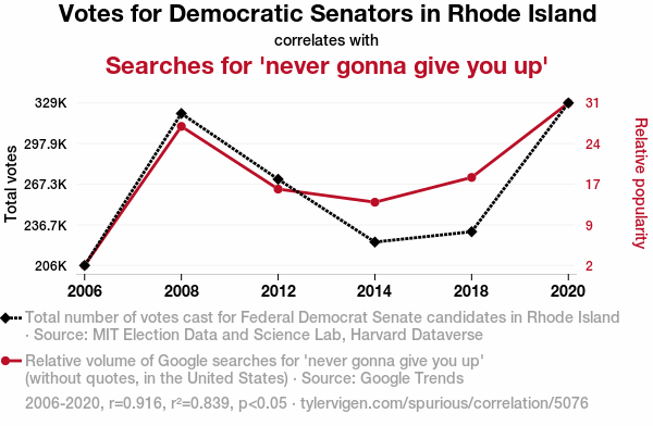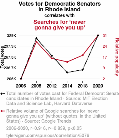 User prompt: Please make up a funny explanation for how an increase in Democrat votes for Senators in Rhode Island caused Popularity of the 'never gonna give you up' meme to increase.