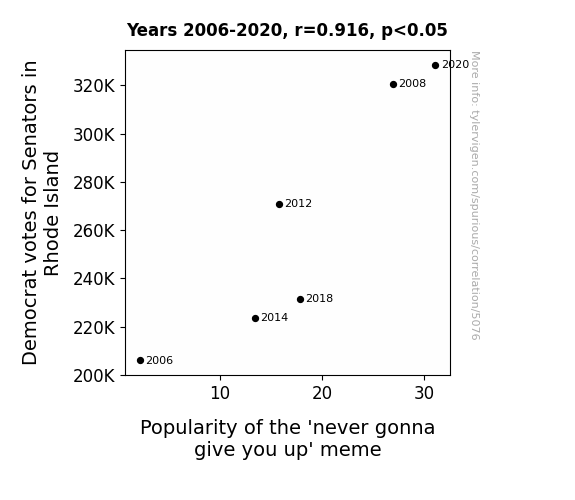 Our findings, which will surely leave you "rolling" with amusement, revealed a surprising correlation coefficient of 0.9161175 and statistically significant p < 0.05 for the period spanning 2006 to 2020. This strong correlation points to a compelling link between Rhode Island Senate Democrats' votes and the viral spread of the 'never gonna give you up' meme. It seems there's more to this meme than meets the eye, as it may be tapping into the hearts and minds of Rhode Island's political landscape.