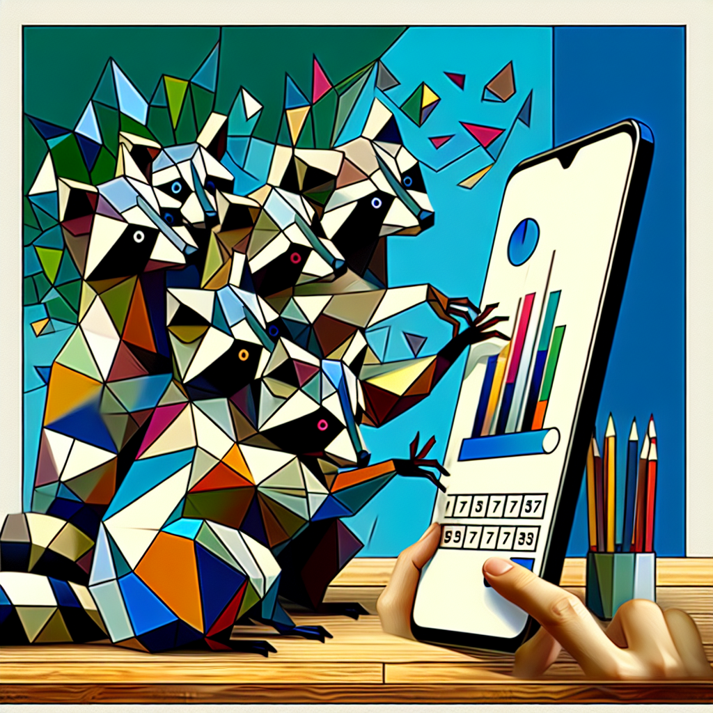 User prompt: Please respond with an image generation prompt that would be likely to create an interesting visual using DALLE-3, using the following style: [ Cubism ] and depicting this scene: A group of raccoons, all named Houston, gather around a smartphone and eagerly tap the "like" button on a new Mark Rober YouTube video. The video displays the average number of likes increasing rapidly as the raccoons watch in fascination. Keep the visual depiction simple. Do not include any words or speech bubbles.