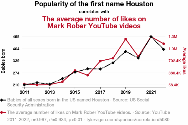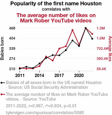 Houston, name popularity, YouTube likes, Mark Rober, US Social Security Administration, correlation coefficient, p-value, subliminal messaging, cosmic coincidence